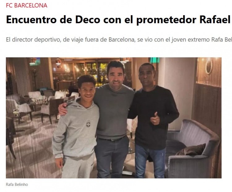 9月25日讯 西班牙媒体《每日体育报》报道,巴萨体育总监德科在酒店与年轻翼锋拉法-贝利尼奥及其父亲会面。