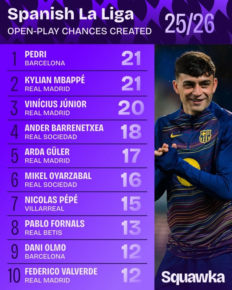 10月16日讯 日前,Squawka统计了本赛季西甲运动活动 战创造机会排行,欧洲杯直播