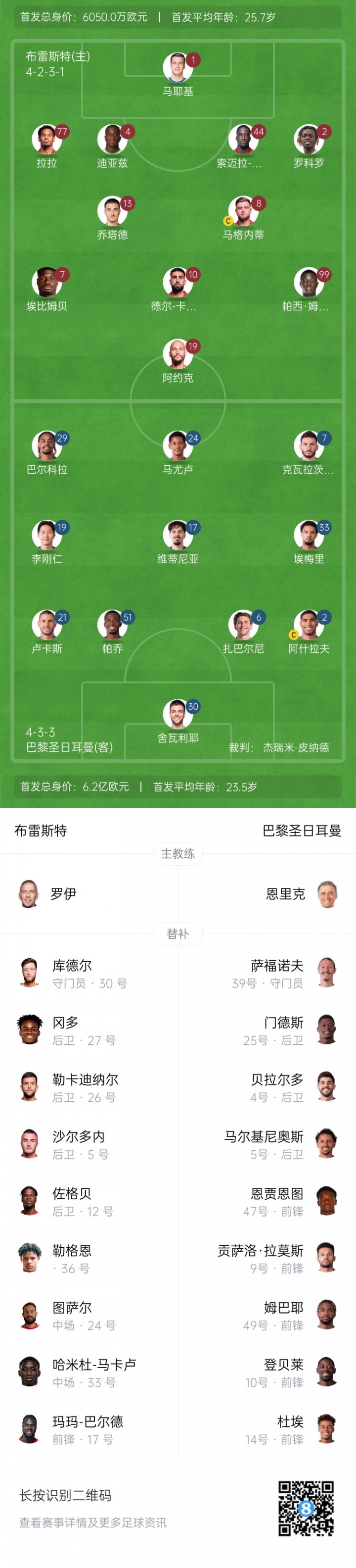巴黎杆位:30-舍瓦利耶、2-阿什拉夫、6-扎巴尔尼、21-卢卡斯·埃尔南德斯、51-帕乔、17-维蒂尼亚、24-马尤卢、33-扎伊尔·埃梅里、7-克瓦拉茨赫利亚、19-李刚仁、29-巴尔科拉
