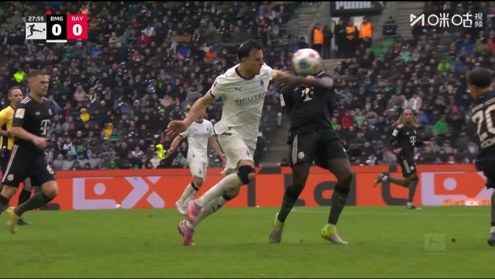 10月25日讯 德甲第8轮,拜仁客战门兴,赛事 第28分钟,足球直播无插件免费在线观看于帕与对方缠斗争抢球权,突然一掌把球棒 走,因此吃到警告 。